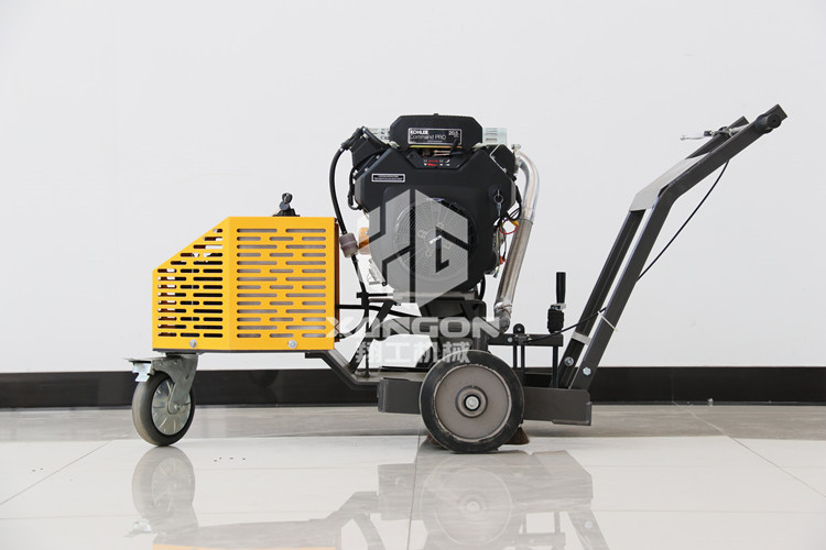 路面開(kāi)槽機(jī)是由動(dòng)力強(qiáng)勁的發(fā)動(dòng)機(jī)作為動(dòng)力源,通過(guò)三角帶帶動(dòng)主軸高速旋轉(zhuǎn),手搖升降手輪使主軸下降,切割裂縫,前行走輪采用萬(wàn)向輪,使整機(jī)在工作中可以按照裂縫自然形成的曲線進(jìn)行切槽,裝有匹配的風(fēng)扇頁(yè)還可以用做開(kāi)槽后對(duì)槽里灰塵的清理,實(shí)現(xiàn)一機(jī)多用的目的。