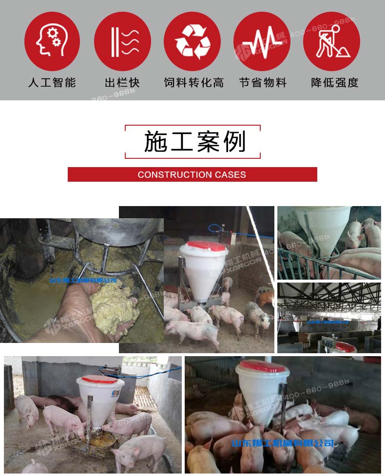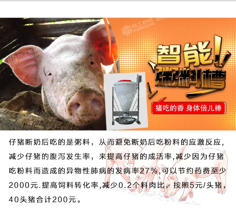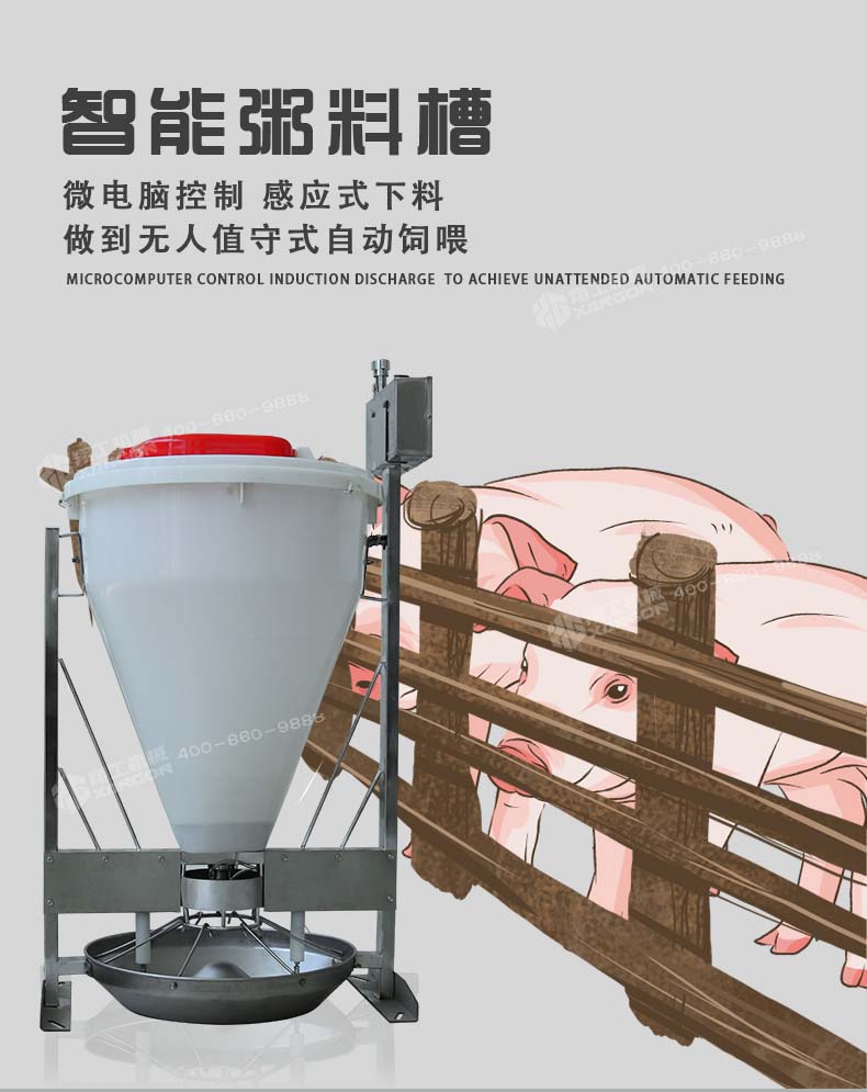 即便按照三個好處累加保育一次可以節(jié)約560元,一年按照使用粥料器保育6—8窩仔豬,累加一臺粥料器智能豬料槽通過在豬場的試驗得出驗證,解決了飼料轉(zhuǎn)化率,豬通過食料相比之前的飼喂每天多增重0.4斤,減少和杜絕了胃腸道病的發(fā)生幾率。合理采食的同時減少了飼料的浪費,省料即是省錢,普通的飼喂飼料浪費率在5%-10%,豬場中使用了粥料器后飼料浪費率控制在2%左右。減少人員的勞動強度,夜晚無法定量投喂的問題。
