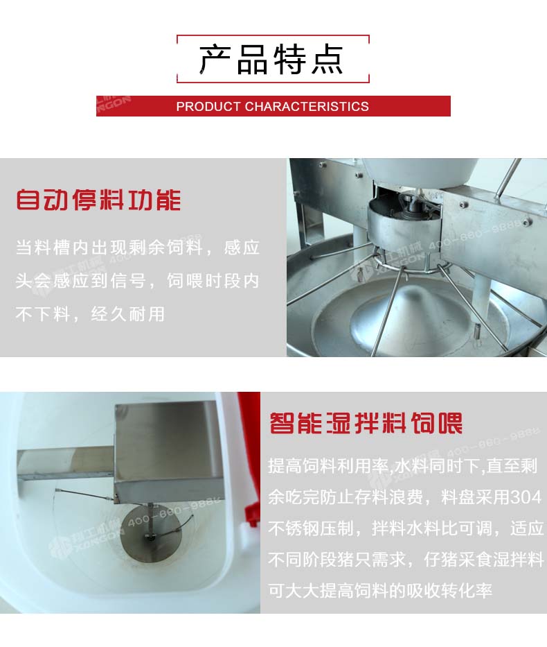 5.智能濕拌料飼喂,提高飼料利用效率。水和料同時下,在料盤內(nèi)混合成適口性 較好的濕直到剩余飼料被小豬吃完,防止料槽內(nèi)存料過多造成浪費。料盤采用304不銹鋼整體壓制,拌料,水料比可調(diào)節(jié),以適應(yīng)不同階段的豬只需求。仔豬采食濕拌料可以大大提高飼料的吸收轉(zhuǎn)化效率。