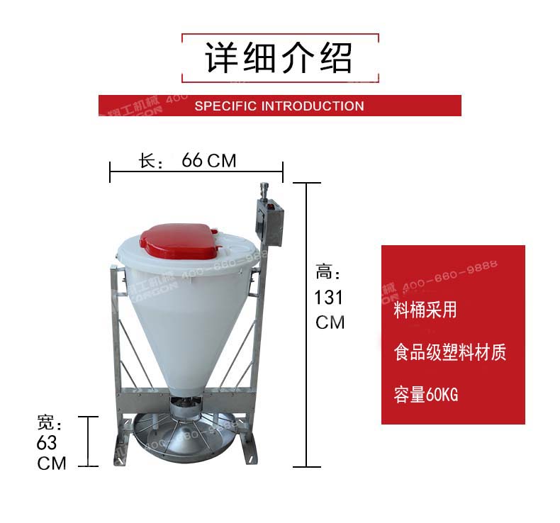 2.外形尺寸131cmX66cmX63cm,料桶采用好的原包料制作,容量60kg。