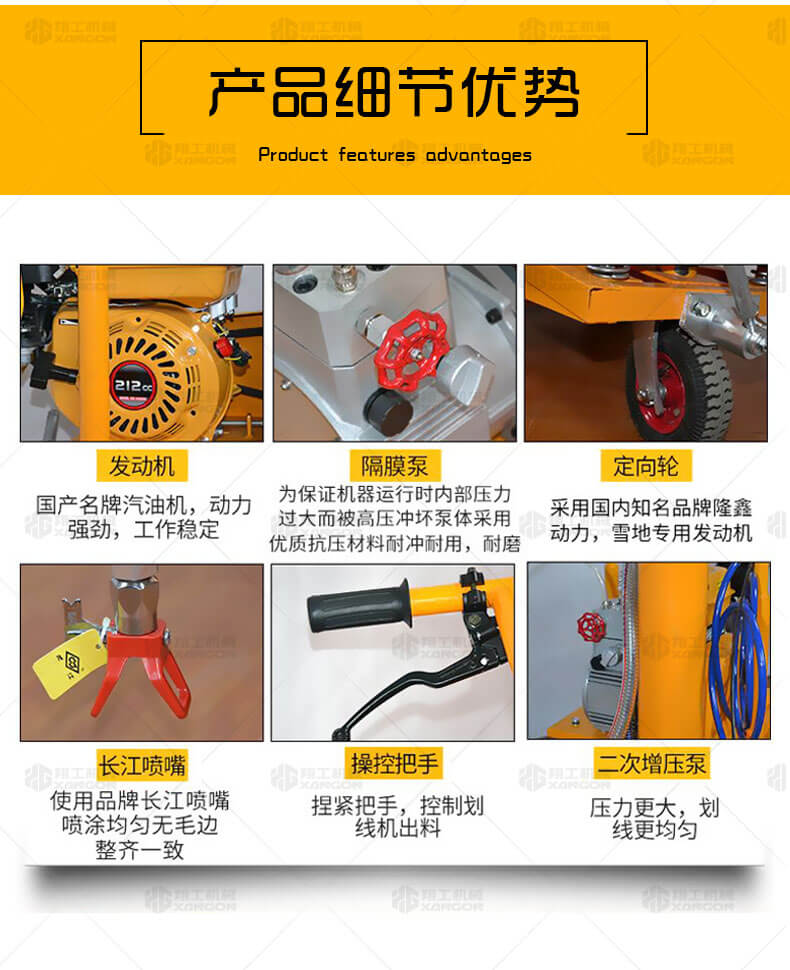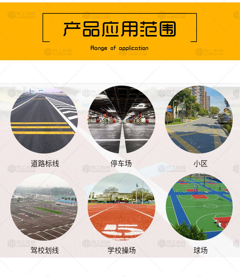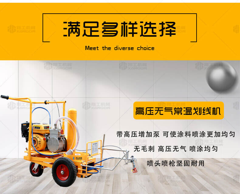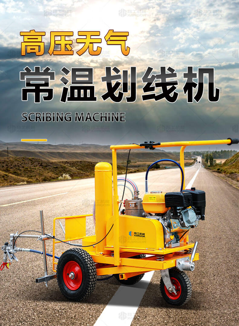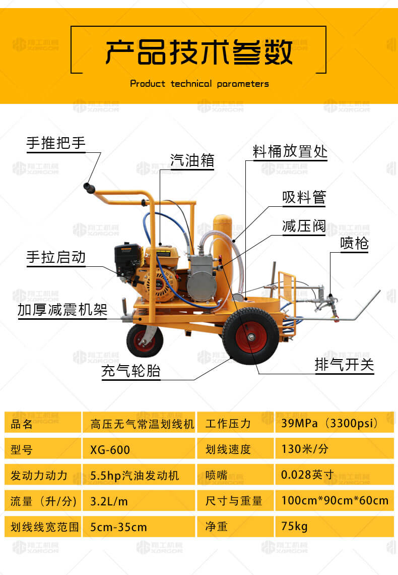 高壓無氣常溫劃線機利用汽油機驅(qū)動單注塞泵,使涂料在機內(nèi)形成高壓進行噴涂,索劃線厚薄均勻邊角齊,噴槍架導向桿升降設(shè)計,調(diào)節(jié)噴涂寬度更為準確方便。該機器是常溫標線施工的專用設(shè)備,主要用于公路、停車場、機場、加油站、公司廠區(qū)等涂畫直線、虛線、曲線、斑馬線、文字、箭頭、圖形、標志等。