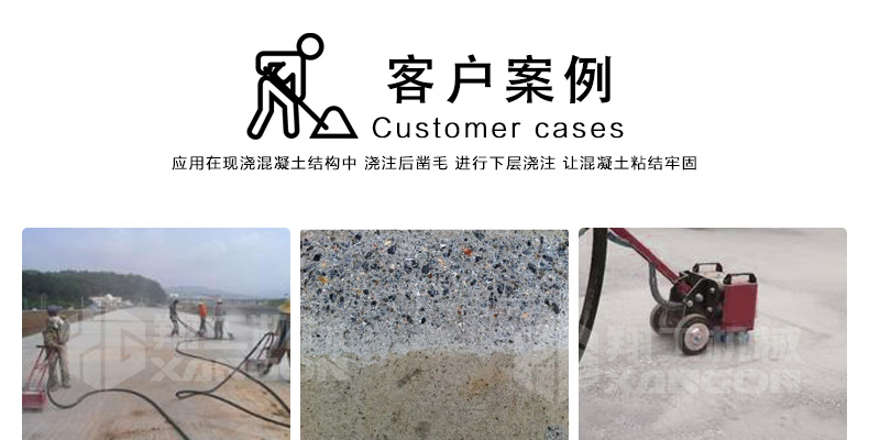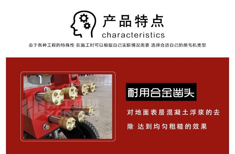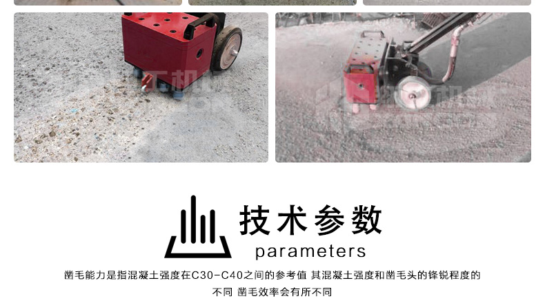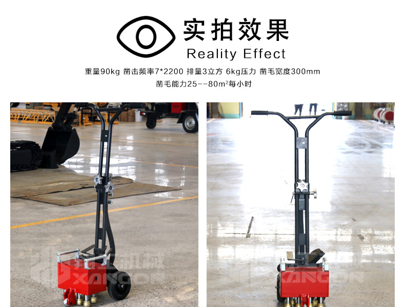 XG-Q7A手推式面鑿毛機(jī),主要為高速公路、高速鐵路的橋面、機(jī)場(chǎng)、橋梁、停車場(chǎng)等各種混凝土地面新建鋪裝時(shí)對(duì)地面表層混凝土浮漿的去除,達(dá)到均勻粗糙而設(shè)計(jì)的。對(duì)各種陳舊地面做翻新前的地坪處理;去除破損地面凸起部分;環(huán)氧樹(shù)脂地面鑿毛;地面做防滑面;對(duì)需二次鋪裝新舊面層打毛等具卓效的鑿毛工具。重量90kg,鑿擊頻率7*2200,排量壓力3立方6kg壓力,鑿毛寬度300mm,鑿毛能力25--80平方每小時(shí)(根據(jù)施工要求如混凝土標(biāo)號(hào)、鑿深等)。