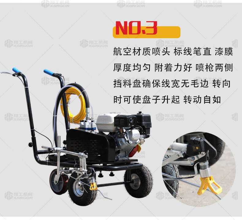 冷噴劃線機(jī)是常溫標(biāo)線施工的專用設(shè)備。主要適用于公路、市區(qū)停車場(chǎng)、機(jī)場(chǎng)等涂劃直線、虛線、曲線、斑馬線、文字、箭頭、圖形標(biāo)志等。形成高壓進(jìn)行噴涂,流量大、壓力穩(wěn)。所劃標(biāo)線線型清晰、附著力強(qiáng)、厚薄均勻、邊齊角齊。具有操作靈活、工作效率高、施工快捷方便、應(yīng)用范圍廣等特點(diǎn)。