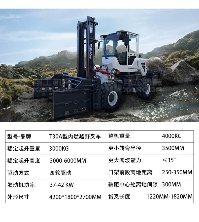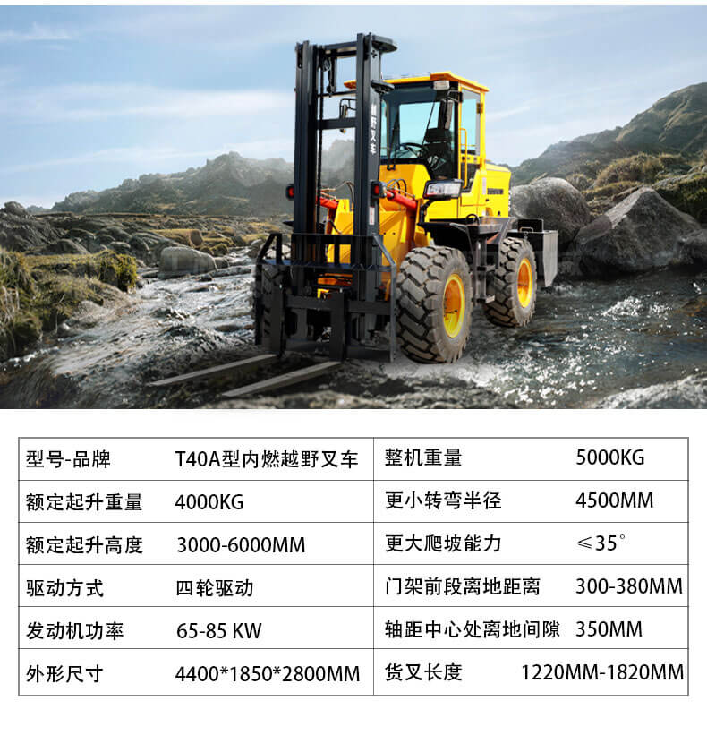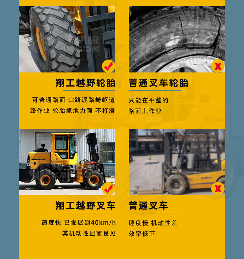 3.普通叉車(chē)只能在平整的路面上作業(yè),而越野叉車(chē)既可以在普通路面上作業(yè),還可以在山路泥路崎嶇道路作業(yè),輪胎抓地力強(qiáng),不打滑。