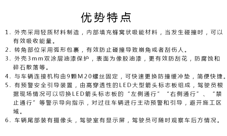 應(yīng)用于道路養(yǎng)護施工作業(yè)、清掃保潔、灑水、綠化修剪、路面事故巡查等工況的安全防護。置于道路車輛、設(shè)備后方,在發(fā)生追尾事故中充當肇事車輛和施工作業(yè)人員或設(shè)備的緩沖區(qū)域,降低對人員的傷害。