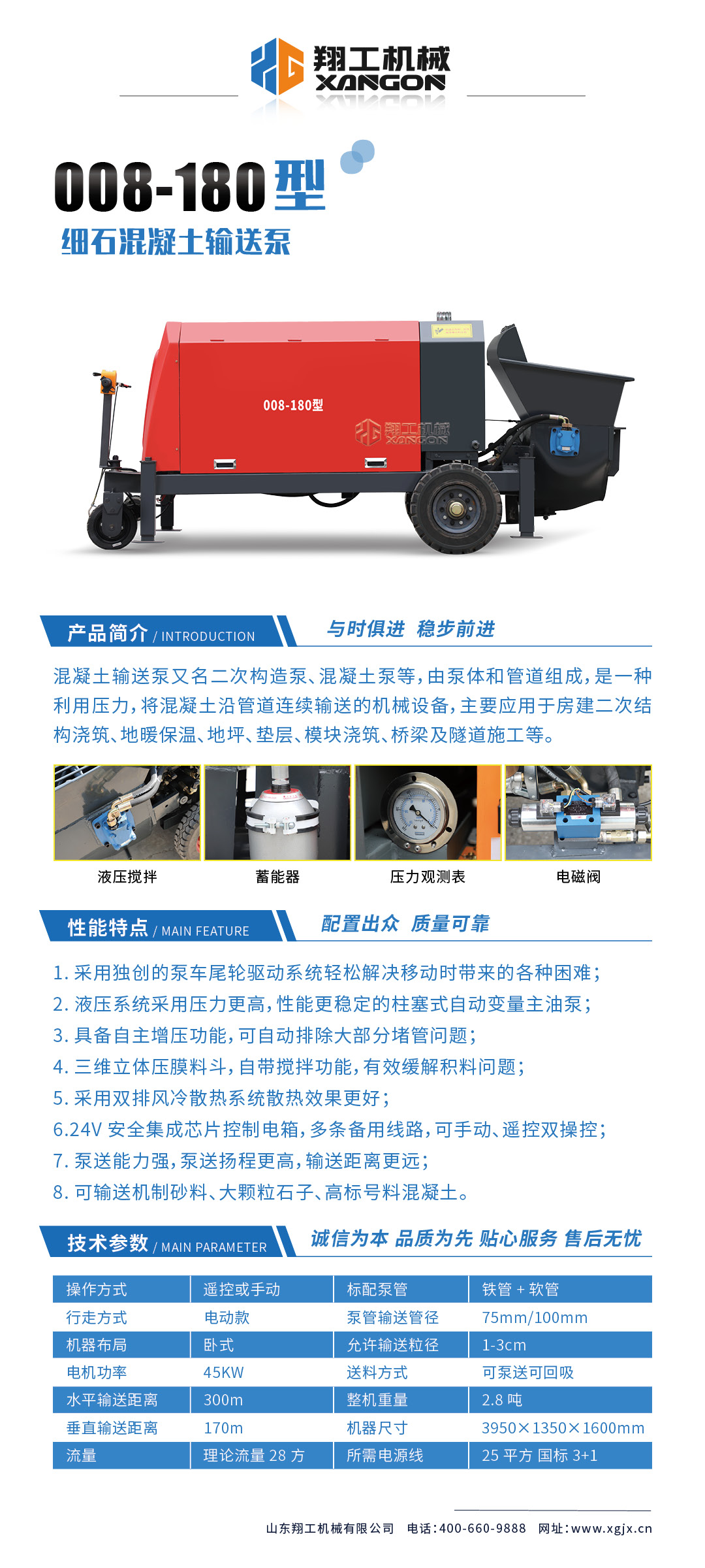 采用獨創(chuàng)的泵車尾輪驅動系統(tǒng)輕松解決移動時帶來的各種困難;采用雙排風冷散熱系統(tǒng)散熱效果更好,液壓系統(tǒng)采用壓力更高,性能更穩(wěn)定的柱塞式自動變量主油泵,采用先進的三維立體壓模一體式自動攪拌料斗可輸送機制砂,高標號混凝土,有效緩解積料問題。