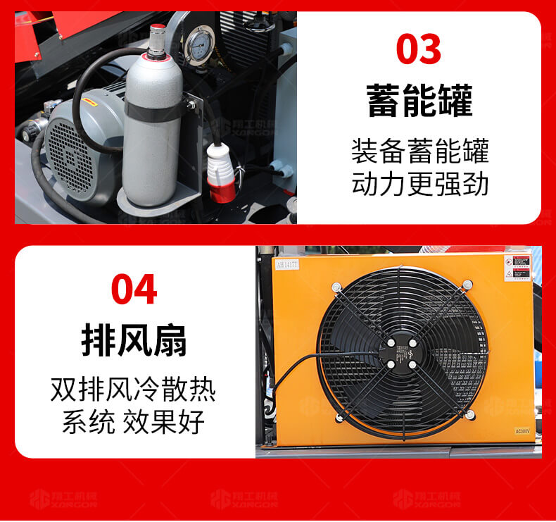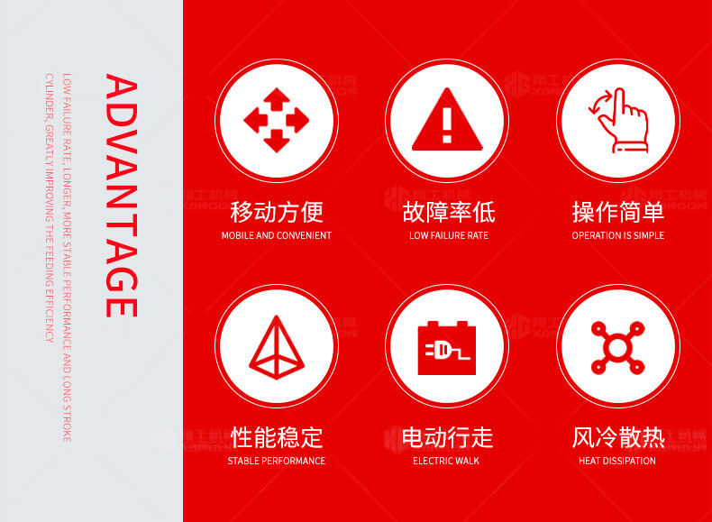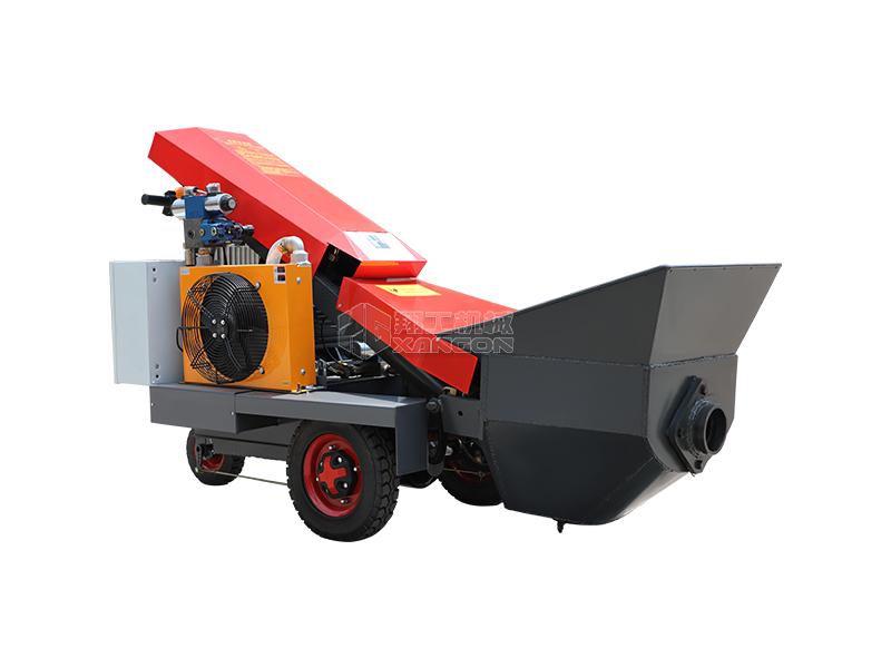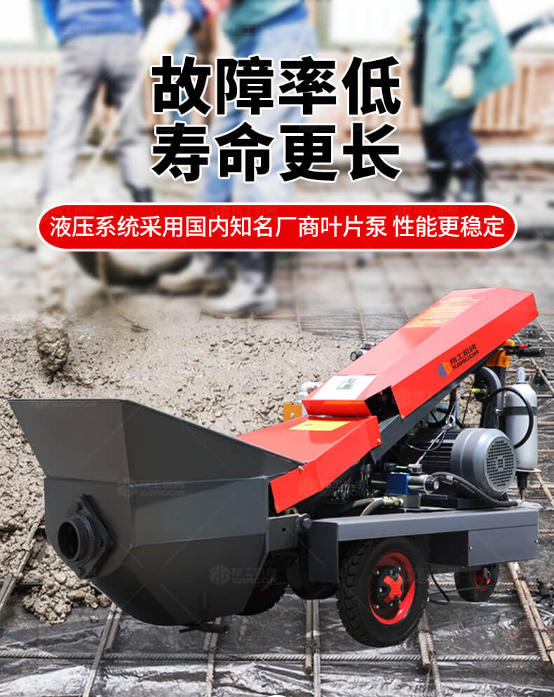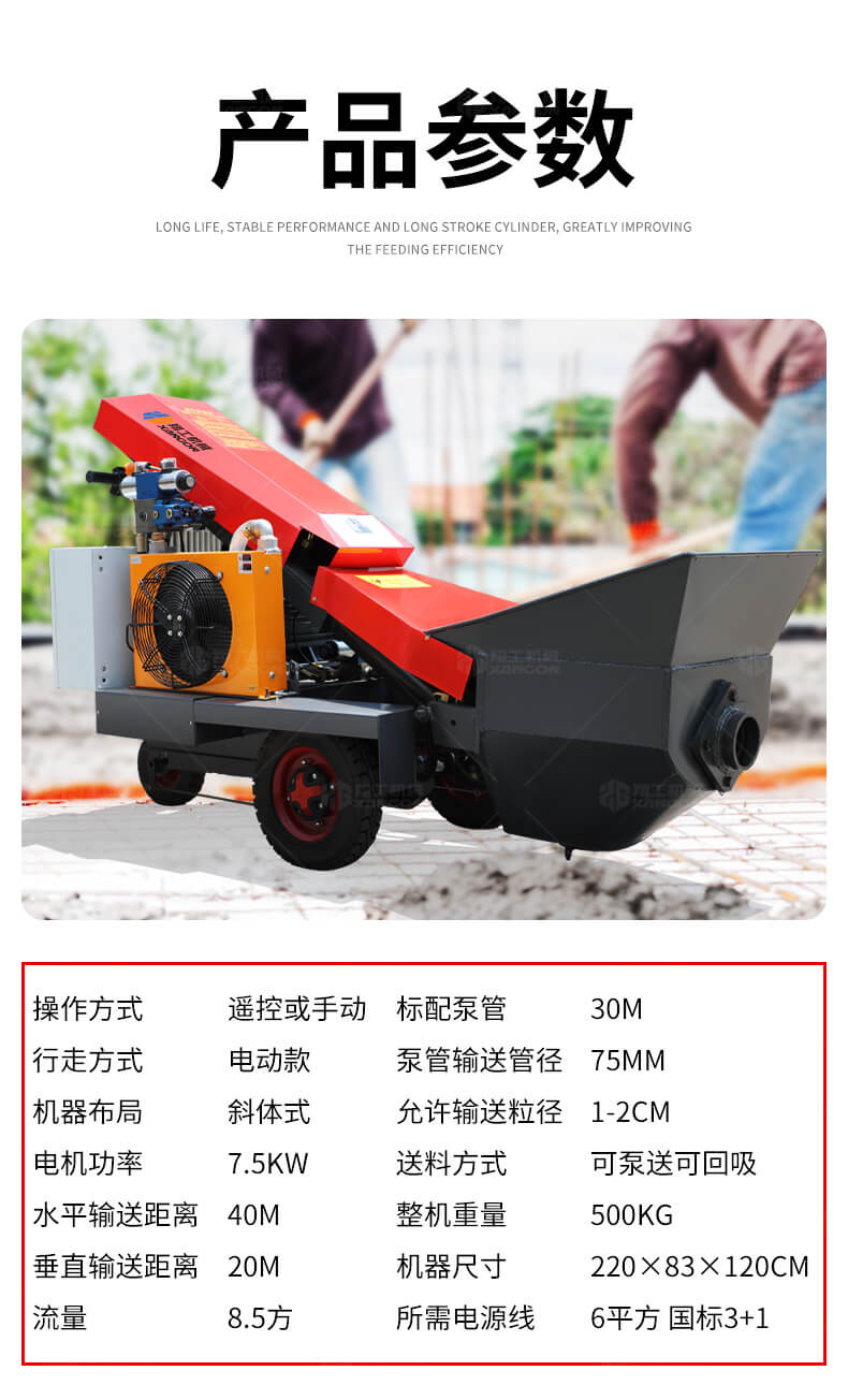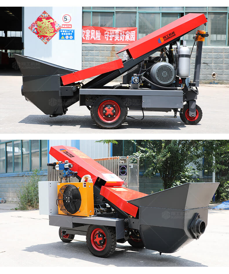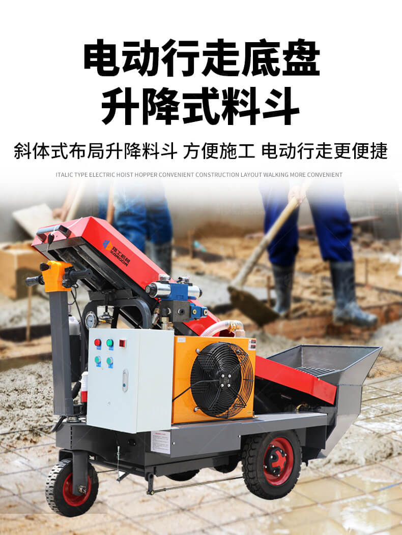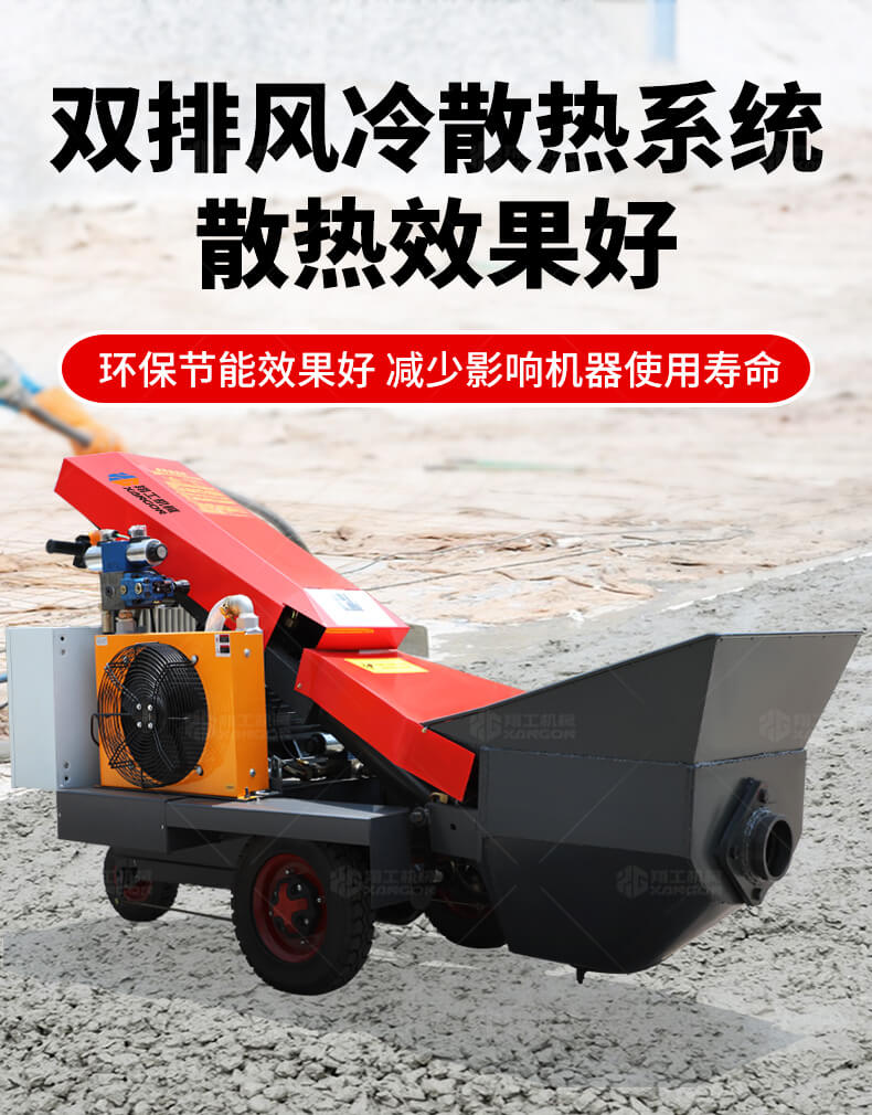 采用電動行走底盤,斜體式布局升降料斗,采用雙排風冷散熱系統(tǒng)散熱效果更好,液壓系統(tǒng)采用國內(nèi)知名廠商葉片泵,故障率低,壽命更長,性能更穩(wěn)定,超長行程料缸大大提高了輸送效率。